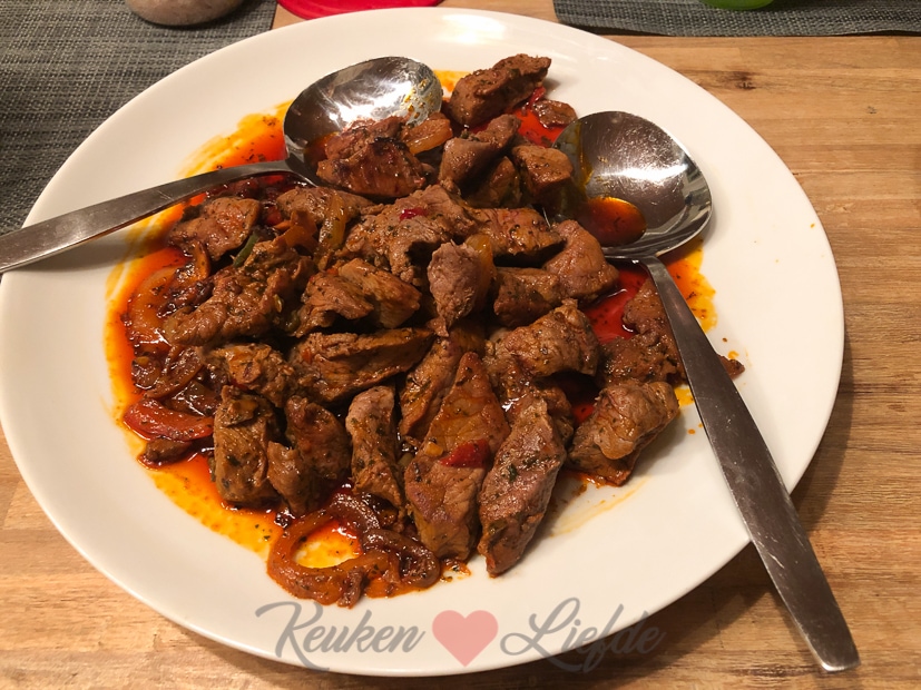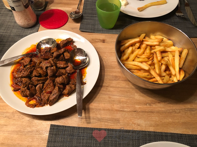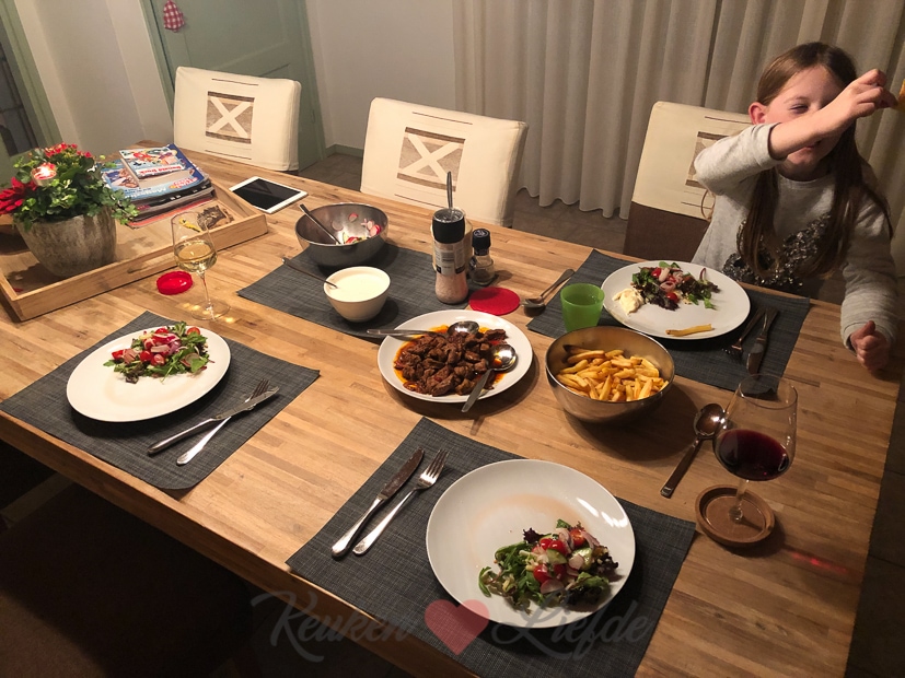 ’s Avonds eten we gemarineerde biefstukreepjes van de slager met ovenfrietjes, salade en zelfgemaakte knoflooksaus. Was lekker alleen jammer dat de biefstuk in de marinade dreef.