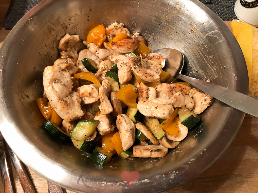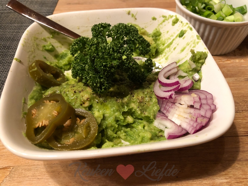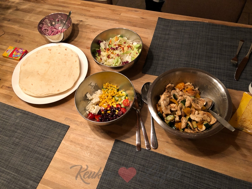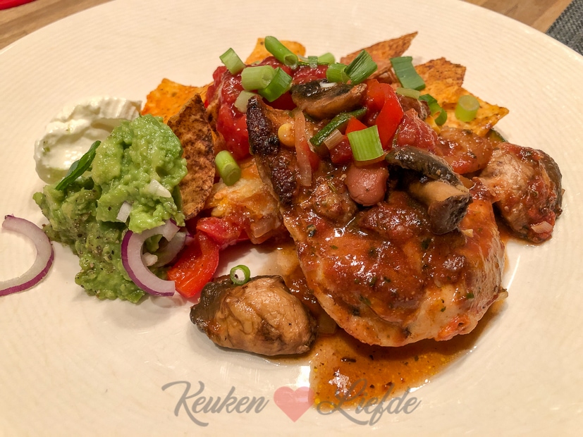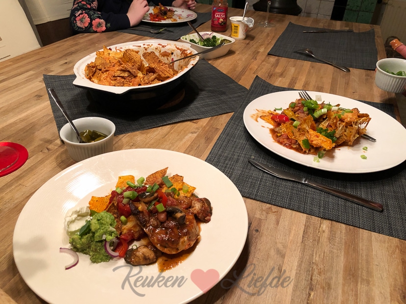 We sluiten de week af met een Mexicaanse schotel met kipfilet, groenten en tomatensaus gegratineerd met tortillachips en kaas uit de oven. Kipfilet aanbakken in de koekenpan en in ovenschaal leggen. Dan groenten bakken in de koekenpan en bovenop de kip. Uitje en knoflook fruiten in de koekenpan met snufje komijnpoeder, korianderpoeder en chilipoeder en inhoud van blik gepelde tomaten stukjes toevoegen. Aan de kook brengen en op smaak brengen met zout en peper en snufje suiker. Over de kip en groenten verdelen. Tortillachips en kaas erover verdelen en even gratineren in de oven. Erbij serveren guacamole, crème fraîche, jalapeño pepers uit een pot en wrapsalsa uit een potje. Eet smakelijk!