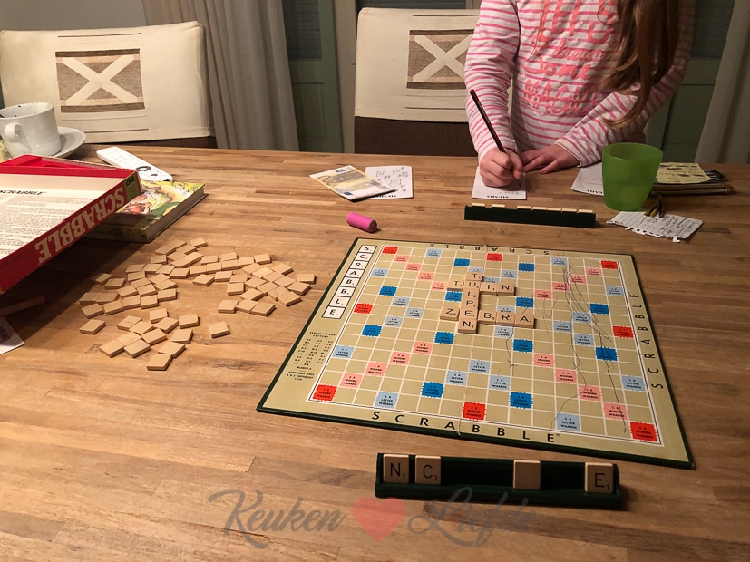 Na de soep spelen we een potje scrabble, die zag ik onlangs liggen bij mijn schoonouders en mocht ik meenemen om uit te proberen. We vonden het alledrie leuk!