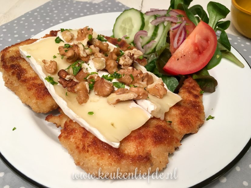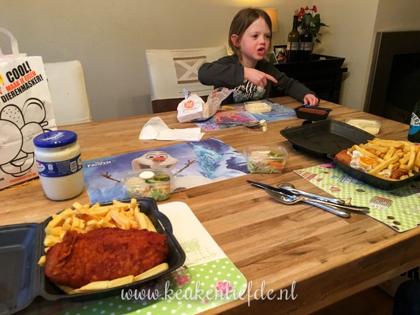 Als we aan het eind van de middag thuiskomen ga ik aan de slag met het avondeten. Ik maak zelf kipschnitzels. Ella-Marie krijgt er één met brie, walnoot en honing en Johan en ik smullen van een kipschnitzel met champignonroomsaus. Erbij eten we ovenfrietjes en sla. Weekendverwennerij!