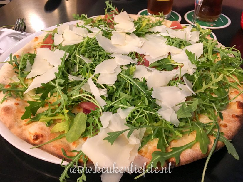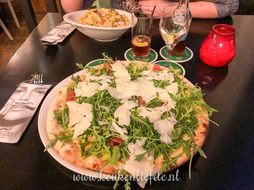 Ik ga ’s avonds met een vriendin in Arnhem naar Soof 2. Daarvoor eten we een hapje bij Happy Italy. Ik ben fan van die tent! Heel erg sfeervol zit je er niet (druk en groot), maar het eten is vers, superlekker en niet duur. Omdat de porties enorm zijn, vraagt de bediening standaard of je een doggybag mee naar huis wilt nemen. Top! Ik kies een pizza met mozzarella, San Daniela ham, rucola en Parmezaan (€ 9,75). Mijn vriendin kiest een pasta met roomsaus, garnalen, Spaanse peper, paddestoelen en peterselie (€ 8,75). Smullen!
