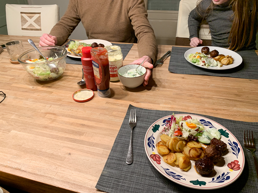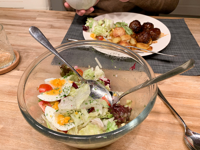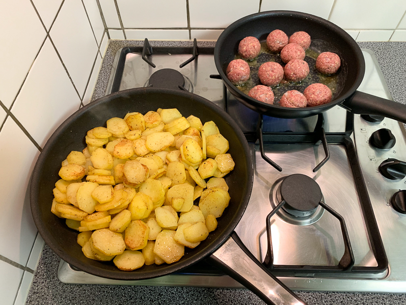 Ik heb de hele dag geen idee wat we ’s avonds moeten eten. In de kelder vind ik nog een halve zak vastkokende aardappels en in de koelkast ligt nog kropsla die op moet. Ik stuur Johan een appje of hij bij de supermarkt gehakt mee wil nemen. Vanavond eten we gebakken aardappels en gehaktballetjes met een salade.