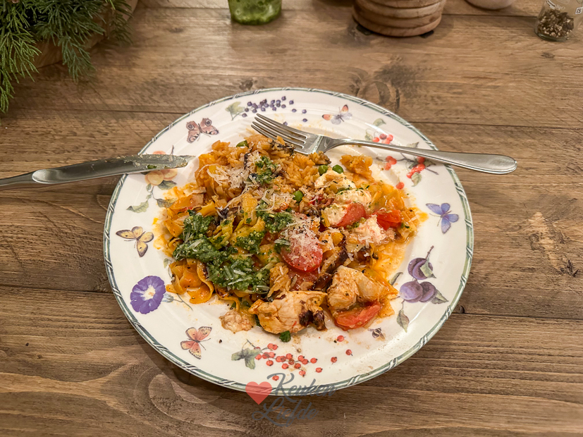De dinsdag begint weer zoals altijd. De wekker gaat vroeg en als Johan en Ella-Marie de deur uit zijn ga ik met een cappuccino op kantoor achter de computer zitten. ’s Middags ga ik de keuken in om alvast het avondeten te maken en ik maak er ook meteen een foto van zodat ik het recept op KL kan delen. Het was erg lekker! Rond een uur of vier ben ik klaar en maak ik een lekkere wandeling met Nacho. Het water in de uiterwaarden is inmiddels weer gezakt dus we konden beneden aan de dijk lopen. Dat is fijn want dan kan Nacho loslopen en lekker rennen. ’s Avonds hoefde ik alleen maar het eten van vanmiddag op te warmen en dat was ook fijn.
