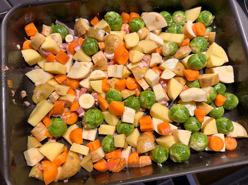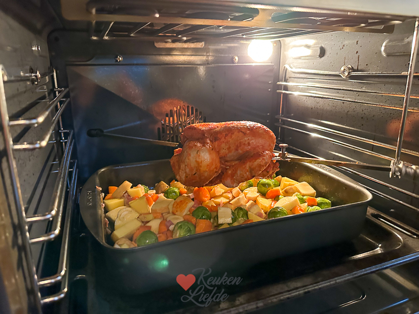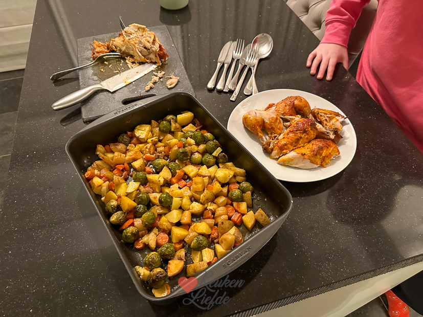 We ontbijten met pancakes en daarna stappen we met Nacho in de auto om een lekkere boswandeling te maken. Als we eind van de middag weer thuis zijn wordt er een pot thee gezet en gaat Ella huiswerk maken. Johan en ik gaan samen in de keuken zitten en bereiden het avondeten voor. Op het menu staat een hele kip van het ovenspit en een grote braadslede gevuld met aardappel en groenten die we onder de kip in de oven schuiven. Was heerlijk! Een geweldige uitvinding zo’n ovenspit.