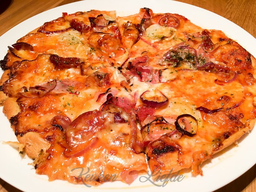 Moe maar voldaan rijd ik in de drukke avondspits weer terug naar huis en haal ik dochterlief bij mijn schoonouders op. Onderweg naar huis hol ik nog even de supermarkt in om een boodschapje te halen, maar dan schiet er iets verkeerd in mijn nek en zit alles op slot. Heb ik weer. Gelukkig heeft El al bij mijn schoonouders gegeten en hoef ik alleen voor mezelf te koken — Johan zit voor zijn werk in België en komt morgenavond pas weer thuis. Vanmorgen had ik al een bolletje pizzadeeg uit de vriezer gehaald die ik maandag had gemaakt en die hoef ik alleen maar uit te rollen en te beleggen.