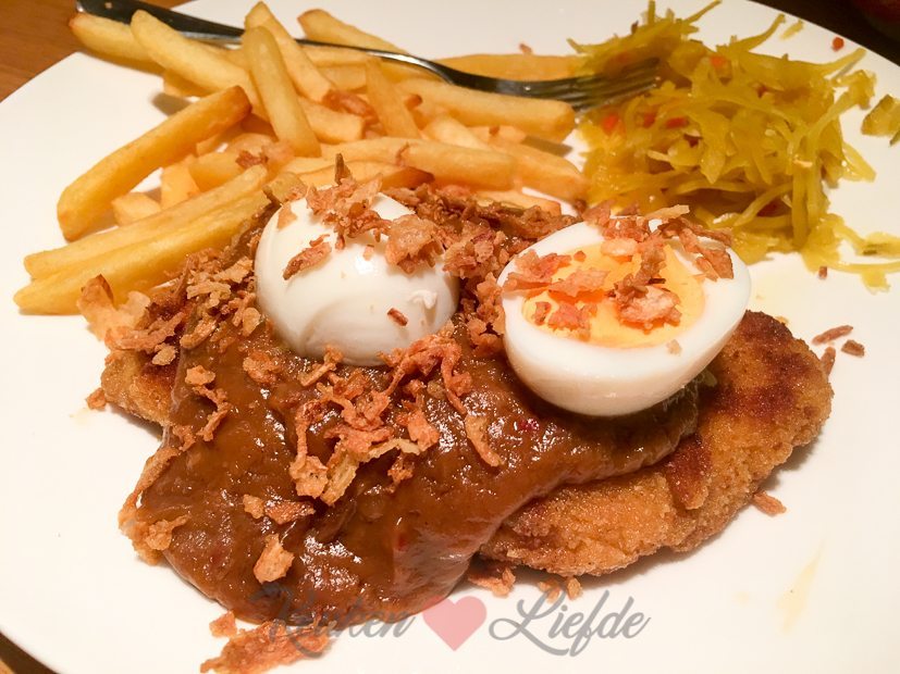 Johan is weer thuis en dus eten we ’s avonds weer gezellig met z’n drieën. Op het menu staan kipschnitzels (gehaald bij de poelier, maar deze zelfgemaakte zijn ook niet te versmaden) met brie (voor mij en El) en satésaus (Johan) met salade en ovenfrietjes. Smullen!