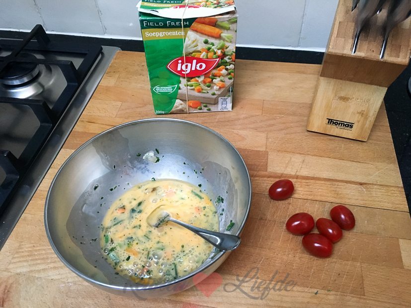 Ik maak een lekker ontbijtje voor mezelf: boerenomelet op een knapperig broodje. Ik heb altijd een pak diepvries soepgroenten in de diepvries, want zo heb je altijd een handje verse groenten bij de hand.