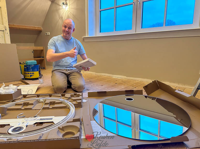 Tussen koken en werken door werd er boven verder geklust. Zo hing Johan een wastafelmeubel en spiegel op en ging ik verder met het verven van het raamkozijn.