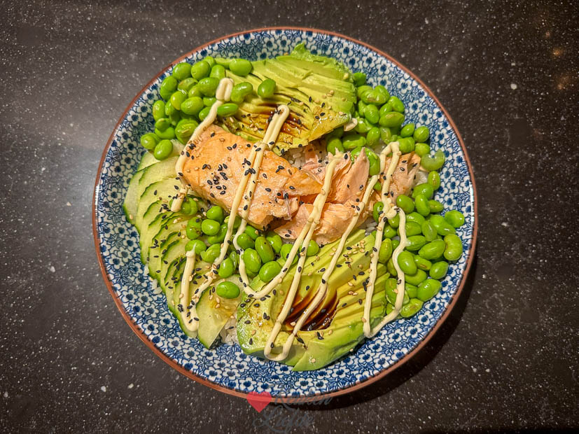 En voor Ella-Marie maakte ik deze sushi bowl met zalm als avondeten: ik gebruikte dit keer een zak kant-en-klare pokébowl rijst die je alleen even hoeft op te warmen, bakte een stukje zalm in de airfryer, kookte wat edamameboontjes en sneed wat komkommer en avocado. Wat sojasaus, kewpie en sesamzaadjes erover en klaar. Als het aan Ella ligt eet ze dit elke dag, sushi is haar favoriete eten.