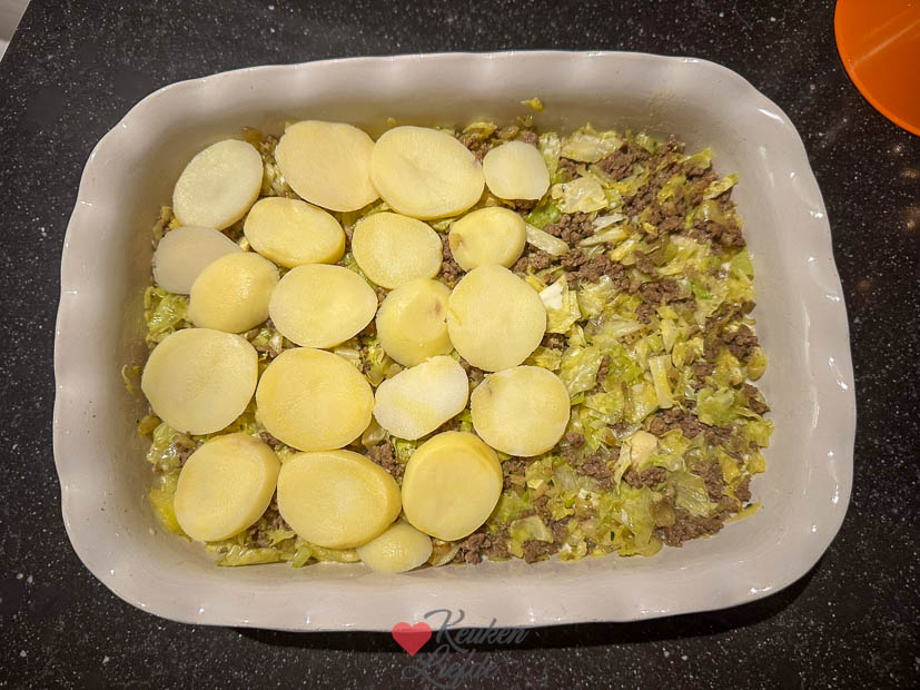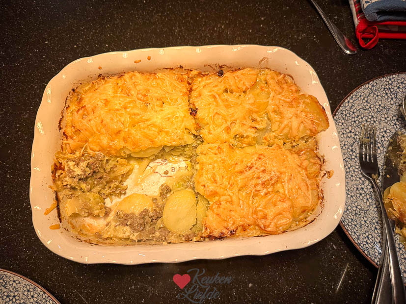 Zondagochtend werd er uitgeslapen en daarna gingen Johan en ik naar beneden om een ontbijtje te maken. Johan maakte croissantjes met ham en en kaas en met suiker en ik maakte er wat roerei bij. De rest van de dag werd er een beetje aangerommeld en ’s avonds maakte in een ovenschotel met spitskool. Dit recept maar dan spitskool ipv prei en paprika en met een gesnipperd uitje en knoflook die ik eerst even aanfruitte. Deze houden we erin, was heerlijk.