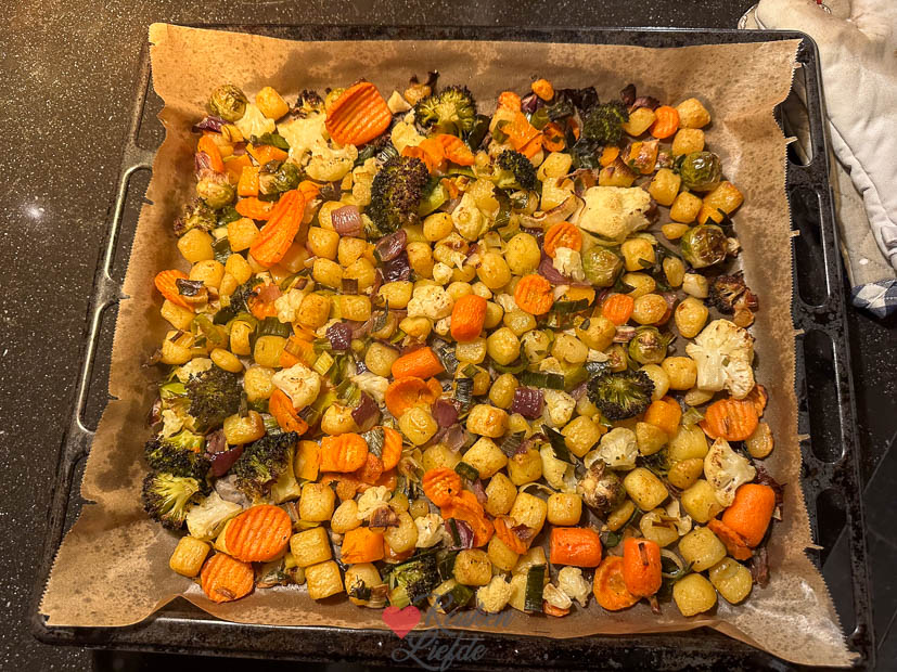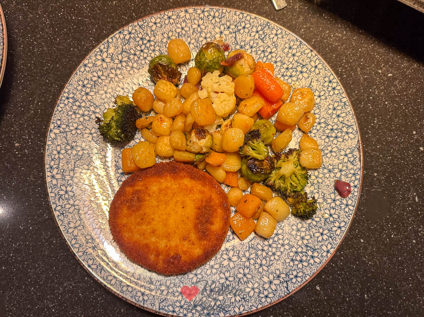 De rest van de week kookte ik ook lekker en makkelijk. Zo gooide ik twee keer krieltjes en groenten op een bakblik voor het avondeten. De ene keer bakte de airfryer er wat kipschnitzels voor me bij, de andere dag een rundertartaartje. Lekker eten zonder ook maar één pan aan te raken. Ik houd ervan. De krieltjes en gesneden groenten hussel je op het bakblik om met een beetje olijfolie, gedroogde tijm of rozemarijn en zout uit de molen en bak je in een voorverwarmde oven op 200 graden, circa 30 minuten tot ze goudbruin en gaar zijn.
