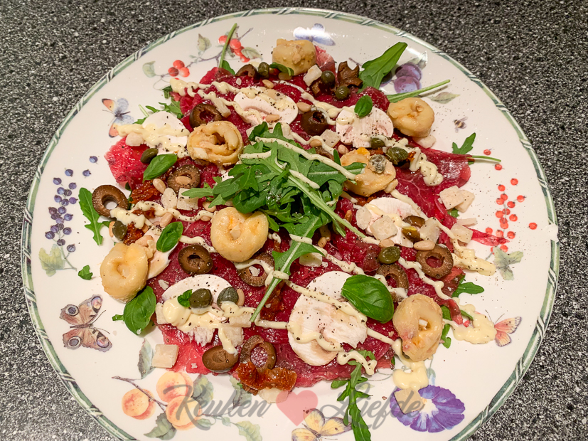 Het aftellen voor kerst is begonnen. Ik heb vandaag weer een normale werkdag op kantoor en probeer zoveel mogelijk recepten uit te schrijven en in te plannen voor in de kerstvakantie. Daarnaast ben ik druk bezig met de voorbereidingen voor kerst: de laatste kerstversieringen in huis halen, lijstjes maken voor kerstboodschappen, ingrediënten bestellen, etc. etc. Je kent het wel. 😉 ’s Avonds voor het eten rijden we met z’n drieën nog even naar het tuincentrum om wat lampjes te halen. We staan even stil bij het kerstdorpje, zo mooi gedaan! Wat een werk en tijd zit daar in (hartverscheurend dat deze ondernemers nu de deur weer hebben moeten sluiten!). Als we weer thuis zijn is het donker en maken we het binnen gezellig. We eten ’s avonds heel makkelijk een bordje carpaccio en stokbrood. Er stond ook nog een restje pastasalade in de koelkast dus die maken we ook op.