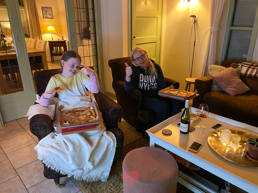 ’s Avonds als alle rotzooi weer is opgeruimd is de pap bij Johan en mij wel op. Het eten dat ik vandaag kookte is wel het laatste waar ik zin in heb om ’s avonds te eten. Tijdens het koken moet ik constant proeven dus ik was er ’s avonds wel even klaar mee. Johan stelde voor om wat eten te bestellen en dat vond ik een goed idee. Pizza it is! Voor mij en El tenminste, Johan bestelde een frietje kapsalon.