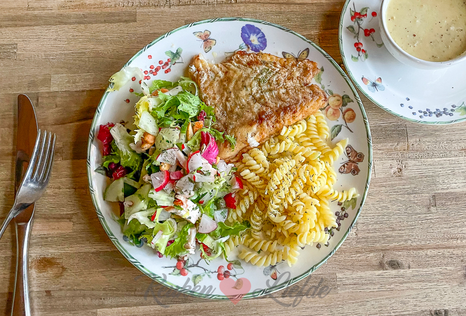 - Gebakken vis, pasta en salade