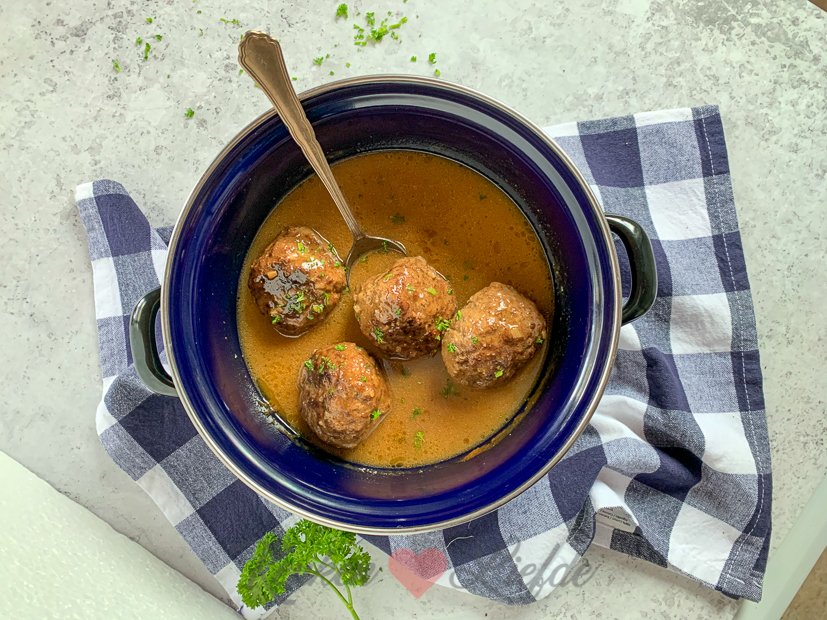Nadat het kijkje in de keuken online staat, verlaat ik mijn kantoorplek en knoop de keukenschort om. Het is weer tijd om te koken. Ik maakte onder andere deze Limburgse ballen met jus! Wat er precies Limburgs aan is? Het lepeltje appel- en perenstroop dat in de jus zit, die geeft een heerlijk zoetje! Het recept deelde ik vorige week al met je op KL en vind je hier.