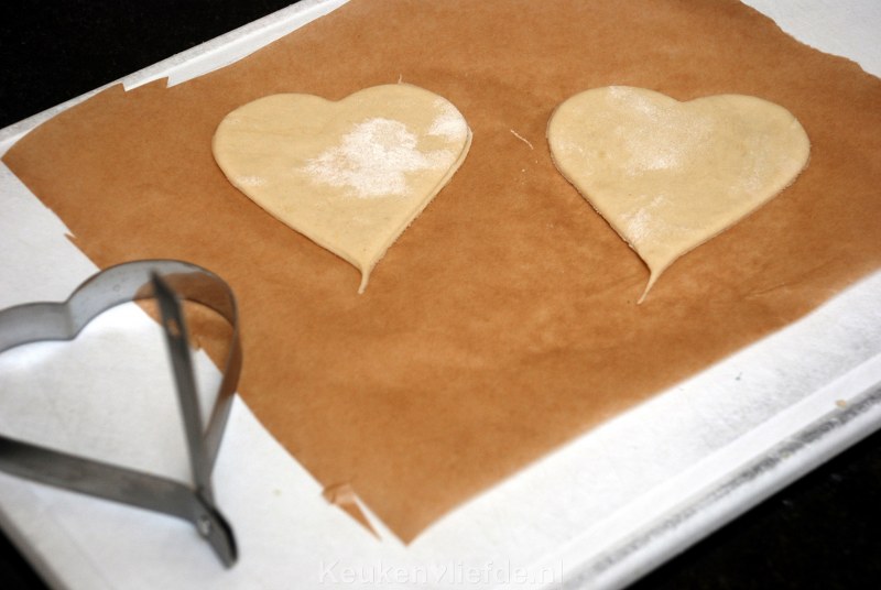Rol het deeg uit op een met bloem bestoven werkblad tot een dunne lap en steek er hartjes uit.
