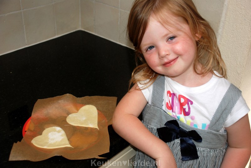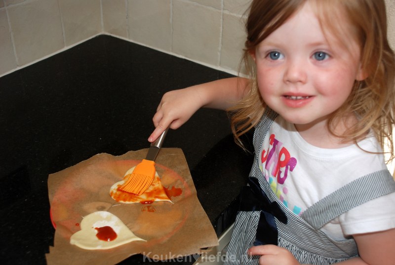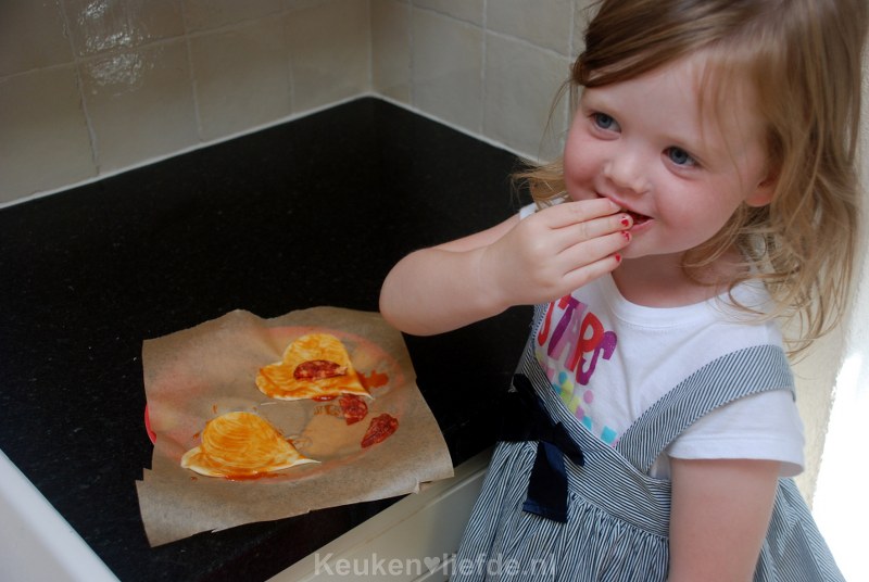 Op het deeg na kan onze dochter, de kleine keukenprinses, deze mini-pizza’s helemaal zelf maken! Want wat is er nu leuker voor een kind dan je eigen pizza beleggen? Met een leuke vorm snijden we hartjes uit het deeg en maken er gezellige hartjespizza’s van. Succes gegarandeerd!