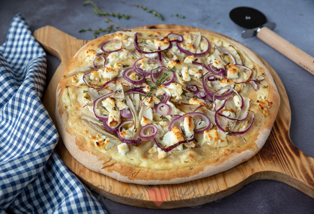 Bestrijk de deegbodem dun met een laag crème fraîche. Beleg de flammkuchen met de verkruimelde geitenkaas, reepjes witlof, rode ui en tijmblaadjes. Drizzle wat honing over de flammkuchen.