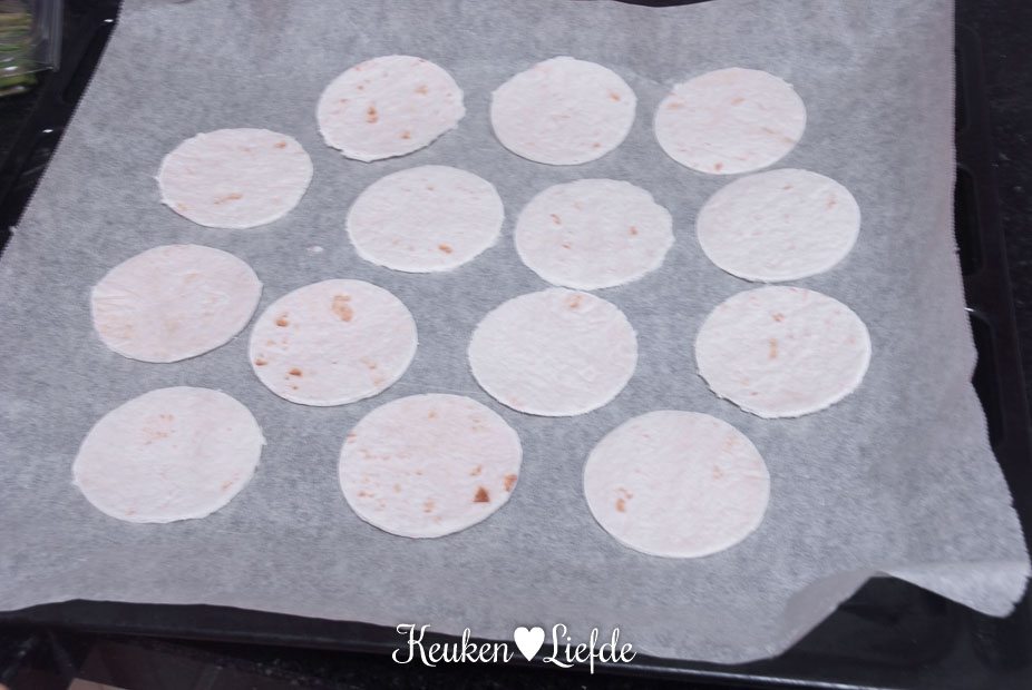 Bak circa 10 minuten in de oven, of totdat de kaas is gesmolten en de tortilla’s licht goudbruin zijn. Bestrooi de mini flammkuchen met wat fijngeknipte bieslook en serveer direct.