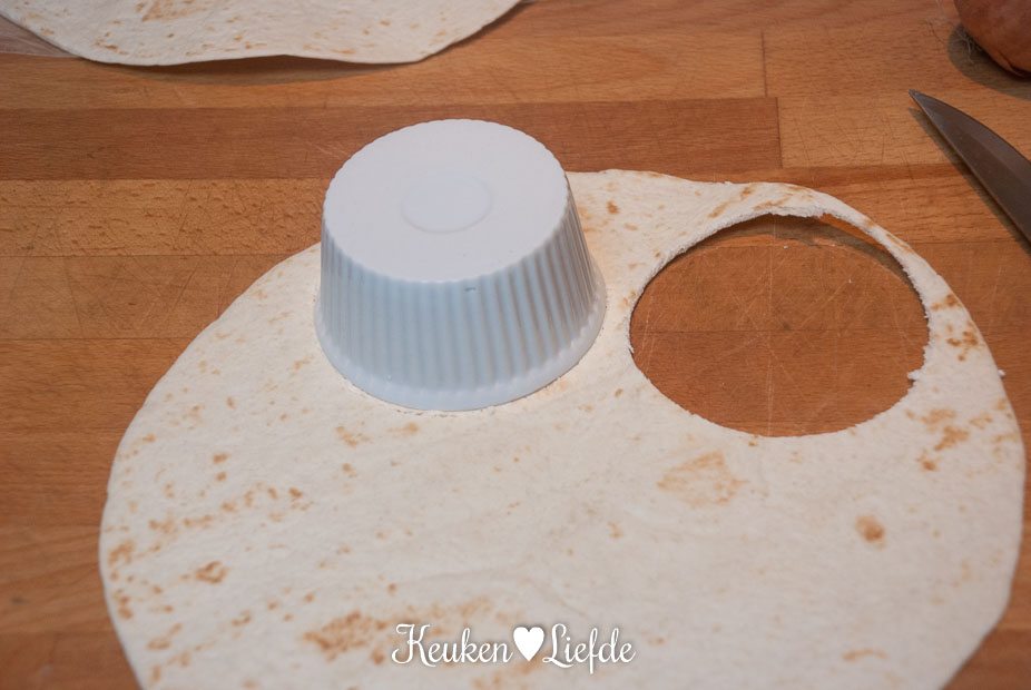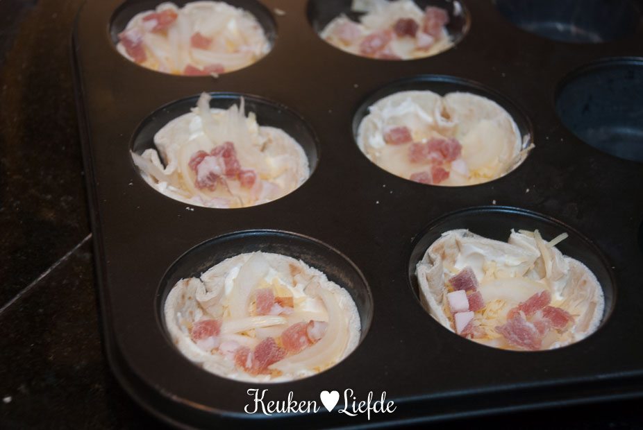 Vet het bakblik in met wat olie. Steek rondjes uit de tortilla’s en druk ze in de muffinvormpjes. (Ik gebruik een muffinbakblik omdat je zo leuke, kleine bakjes krijgt, maar als je dit teveel gedoe vindt, of je hebt geen muffinbakblik, kun je de tortillarondjes ook gewoon plat op een bakblik leggen.) Bestrijk de tortilla’s met een beetje crème fraîche en bestrooi met geraspte kaas, ui en spek.