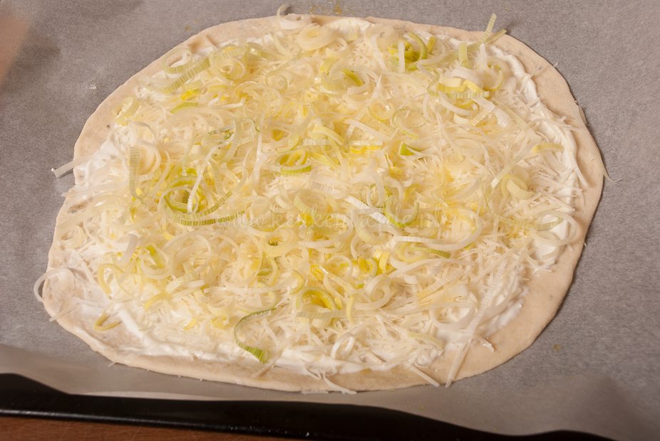 Flammkuchen met prei en gerookte zalm