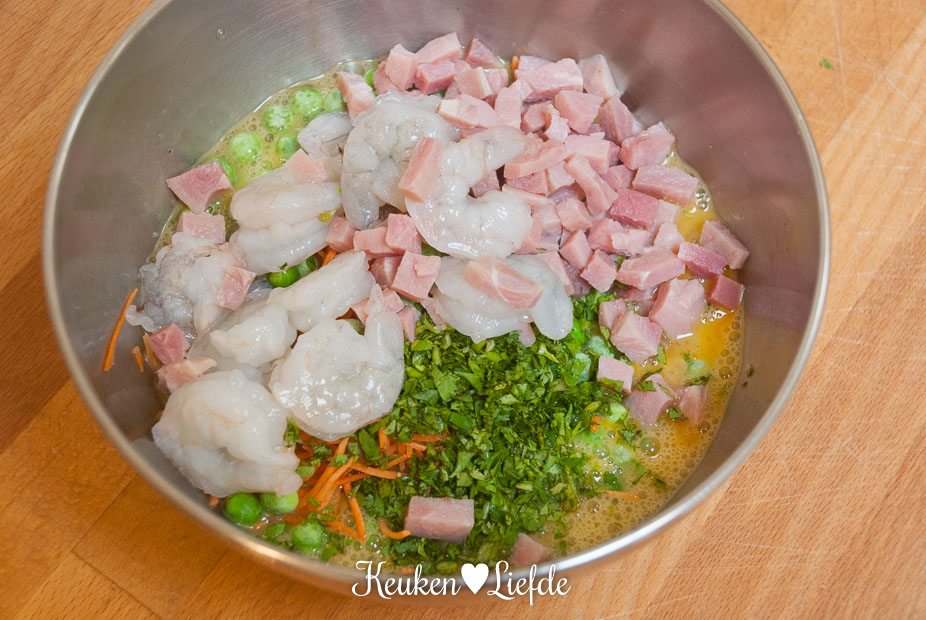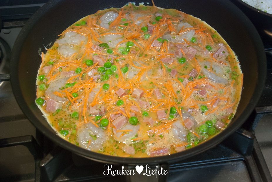 Klop de eieren in een kom los met wat zout en peper en voeg de garnalen, ham, wortel, (bevroren) doperwten en 1 el koriander toe. Roer door. Verhit een koekenpan met wat olie en schenk het eimengsel in de pan. Zet het vuur laag, doe een deksel op de pan en laat de omelet langzaam stollen.