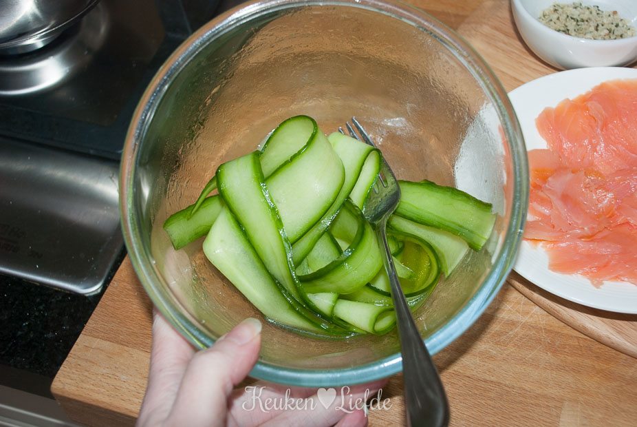 Schil ondertussen de komkommer met de dunschiller, over de lengte in lange plakken (de waterige zaadlijsten gooi je weg). Leg de komkommerlinten in een kom en schenk er wat sushi-azijn en olijfolie overheen, genoeg om de komkommers te marineren.