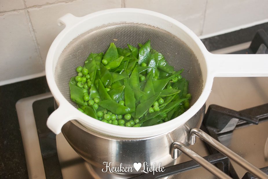 Breng een pan met 1 liter water en de bouillontabletten aan de kook. Voeg de peulen toe en na 30 seconden de doperwten. Kook nog 30 seconden verder en schep de groenten uit de pan in een vergiet. Laat goed uitlekken. Bewaar de bouillon.