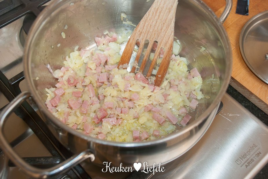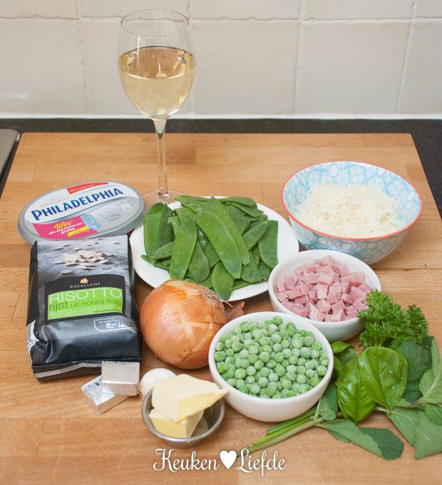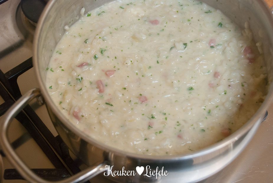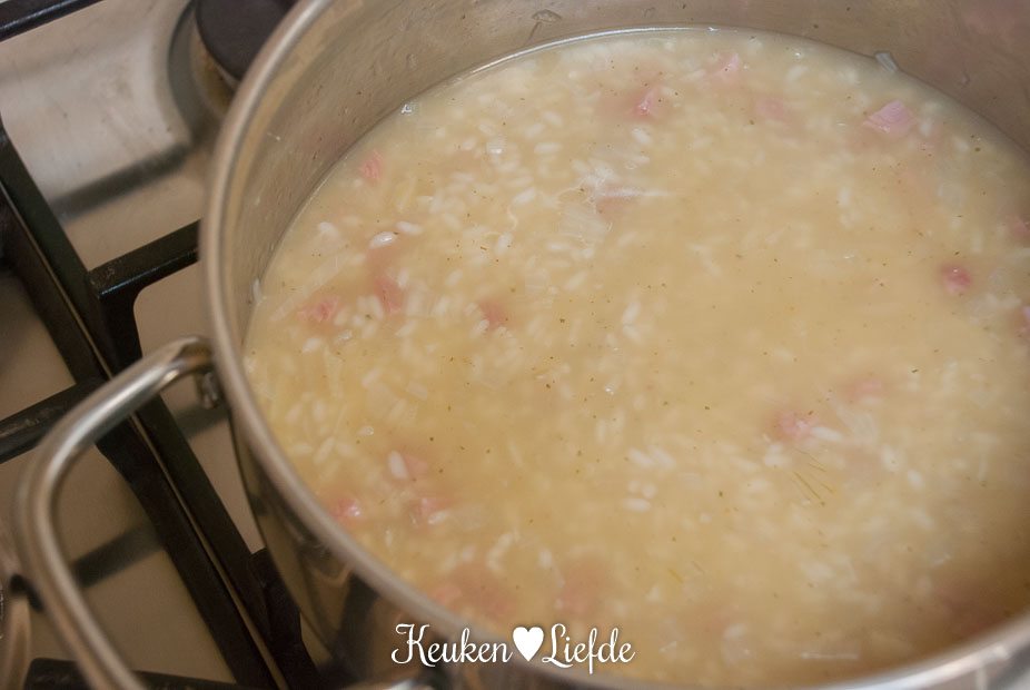 Verhit een ruime hapjespan met wat olijfolie en fruit de ui, knoflook en hamblokjes totdat de ui zacht is. Voeg de risotto toe en bak heel kort even mee. Blus af met de witte wijn en laat inkoken. Voeg zoveel groentebouillon toe, totdat de risotto net onderstaat en zet het vuur laag/middelhoog. Blijf regelmatig roeren en voeg steeds opnieuw wat bouillon toe als de vorige bijna is opgenomen. Ga net zolang door totdat de rijst beetgaar en smeuïg is, je hoeft misschien niet alle bouillon te gebruiken.