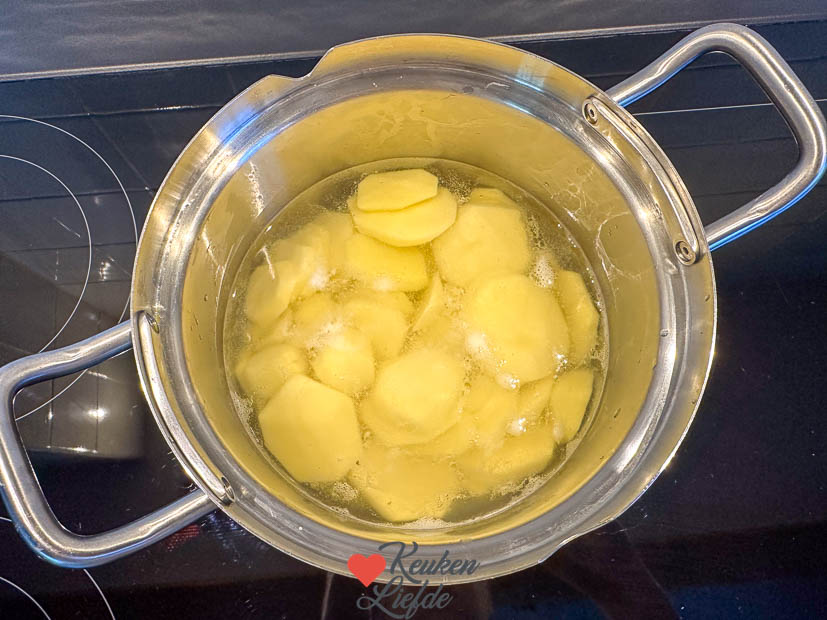 Koop een zak ‘stamppot-aardappelen’, die zijn al geschild en voorgekookt, en snij ze in wat kleinere blokjes. De grootste ‘brokken’ uit de zak ongeveer in 4-en.