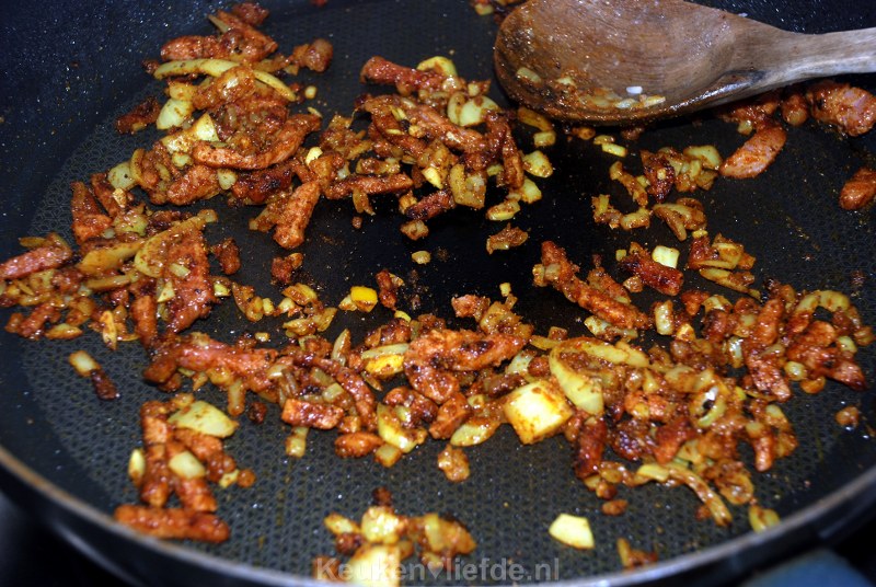 Bak ondertussen de spekjes in een droge koekenpan op laag vuur, langzaam uit. Voeg dan wat olie toe en doe de ui, knoflook en specerijen erbij.