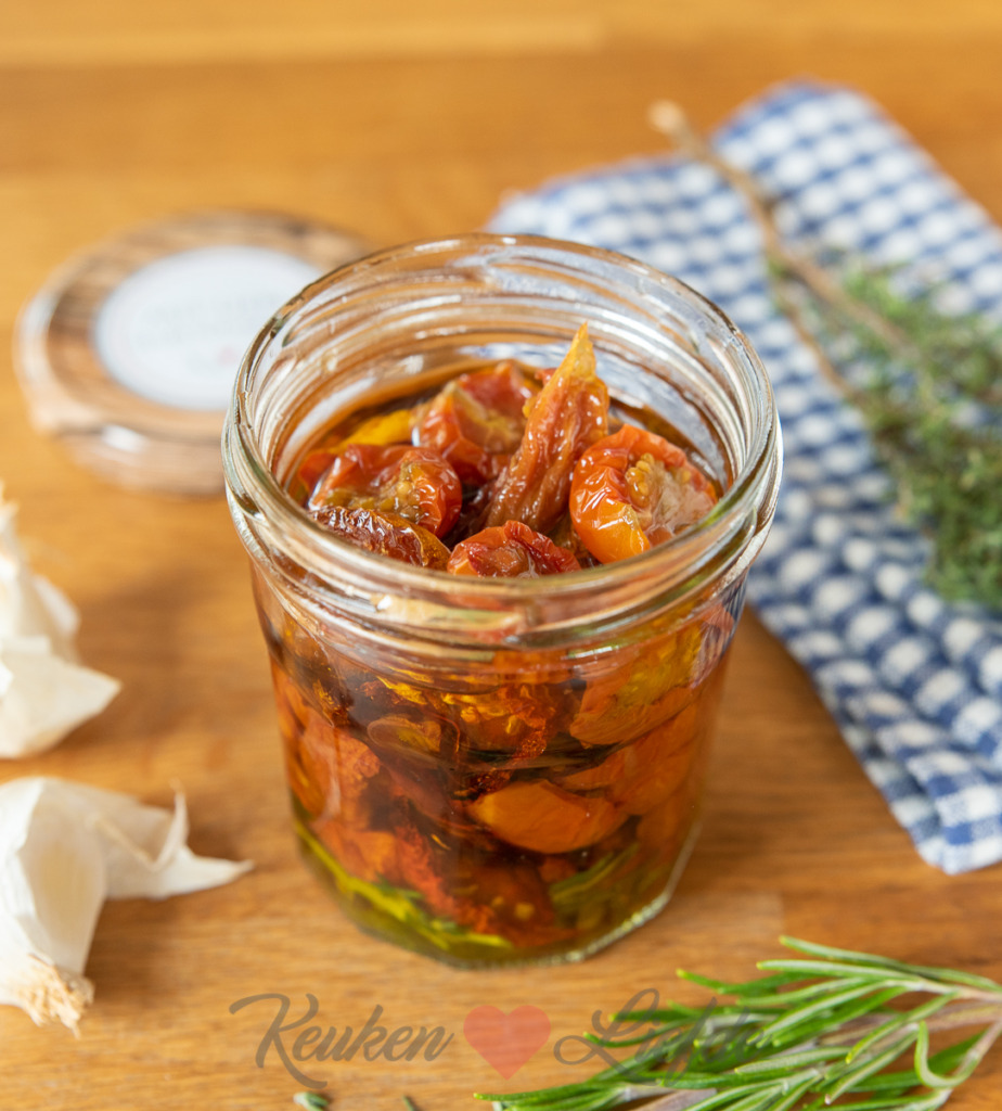 *Hoe zoeter de tomaat, hoe lekkerder het resultaat. Kleine cherrytomaatjes drogen sneller in de oven dan grotere tomaten, maar ook deze kun je goed drogen. Ik gebruikte cherrytomaten en gewone tomaten uit onze moestuin. Cherrytomaten kun je halveren, grote tomaten snijd ik in vieren of in achten.