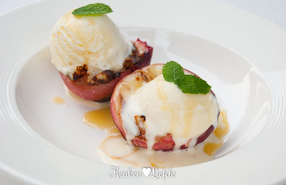 Gegrilde perzik met vanille-roomijs en karamelsaus