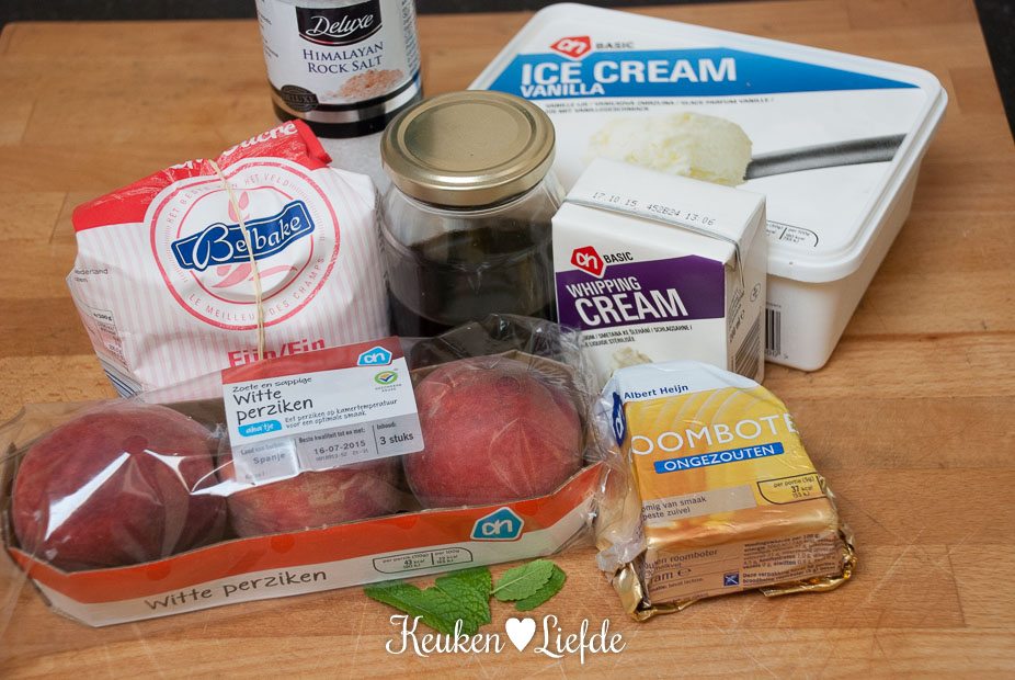 Leg op elk bord een halve perzik (of twee om de grotere gaatjes te vullen) en schep er een bolletje roomijs op. Lepel er wat karamelsaus overheen en garneer met verse munt. Serveer direct.