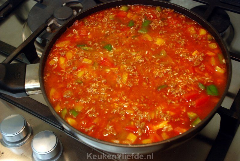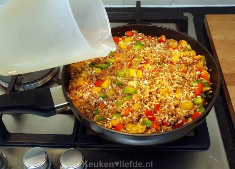 Roer de rijst en de paprika’s erdoor, roer even door en voeg het water toe. De rijst moet net onder staan.