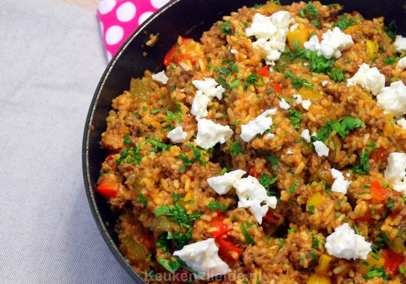 Onze dochter noemt dit gehaktpannetje met paprika en rijst ook wel liefkozend “stoplichtrijst” vanwege de rode, groene en gele paprika. Het is een heerlijk en makkelijk te maken gerecht, want alles gaat in dezelfde pan (En zoals jullie inmiddels weten, daar houd ik van!). De peterselie en verkruimelde feta maken dit gerecht voor mij tot slot helemaal af.