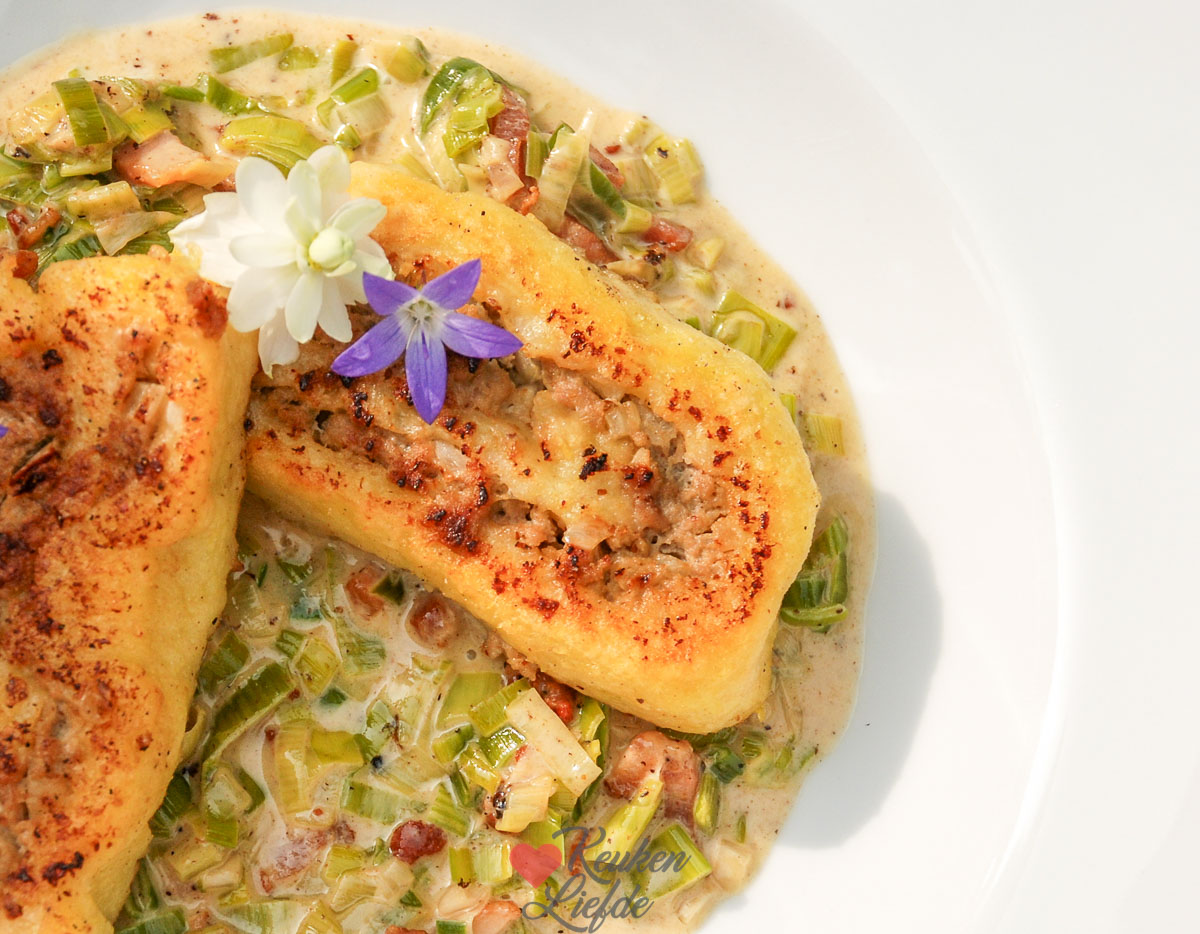 Serveer de gehaktrol op een bedje van gesmoorde prei in spek-roomsaus en geniet van je feestmaal.