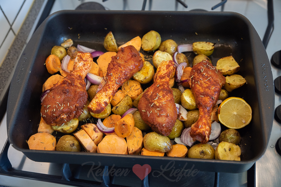 Voeg de wortel, zoete aardappel, rode ui, knoflook, overige rozemarijn, een scheutje extra olijfolie en nog een snuf zout uit de molen toe en hussel om met de aardappels. Als het water in de braadslee verdampt is mag je nog een extra scheut water toevoegen. Leg de kipdrumsticks bovenop de aardappels en groenten. Leg ook de ongebruikte citroenhelft tussen de kip.