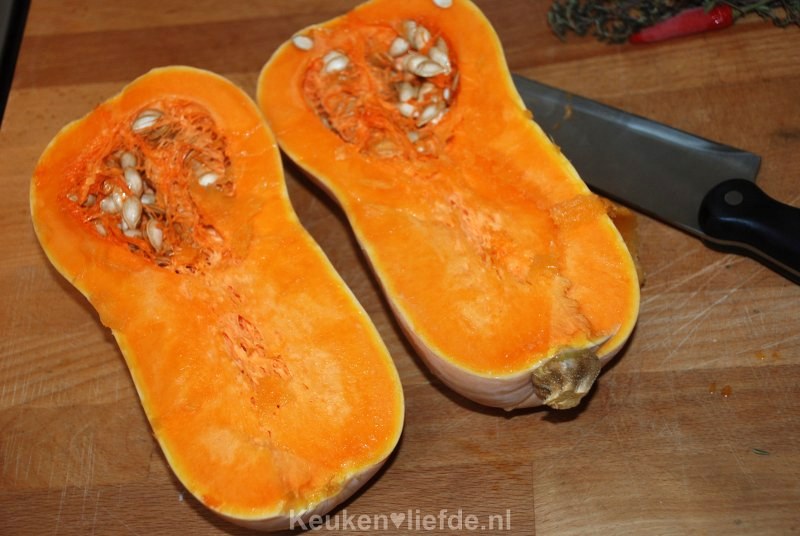 Verwarm de oven voor op 200 graden. Snijd de flespompoen doormidden en verwijder de pitten. Je hebt hier een lang en scherp mes voor nodig!