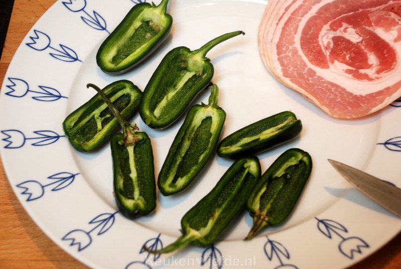 Verwarm de oven voor op 180 graden. Halveer de jalapeños (probeer de steel intact te laten) over de lengte en verwijder de zaadlijsten.