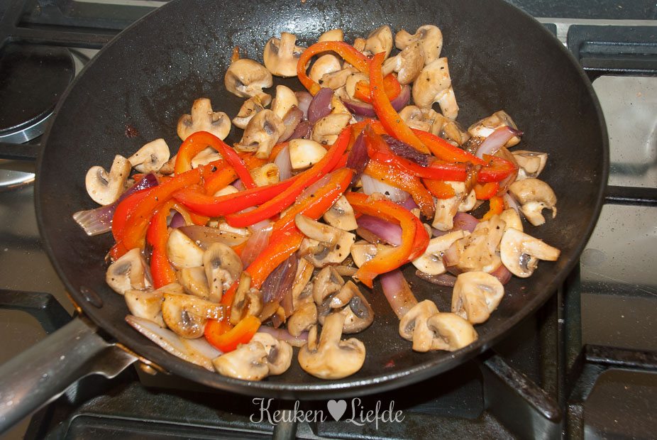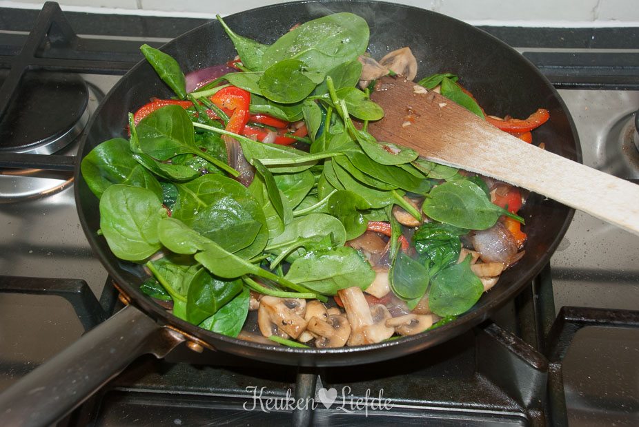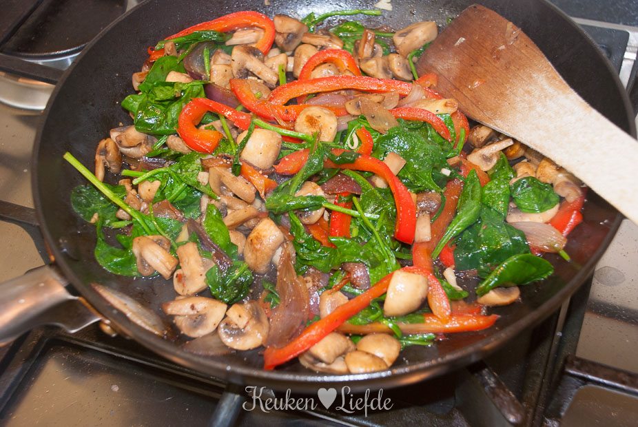 Verhit ook de andere koekenpan met wat olie en bak op hoog vuur de rode ui, paprika en champignons. Voeg als het vrijgekomen vocht verdampt is, de spinazie en knoflook toe en bak kort even mee, totdat de spinazie geslonken is. Zet het vuur uit.