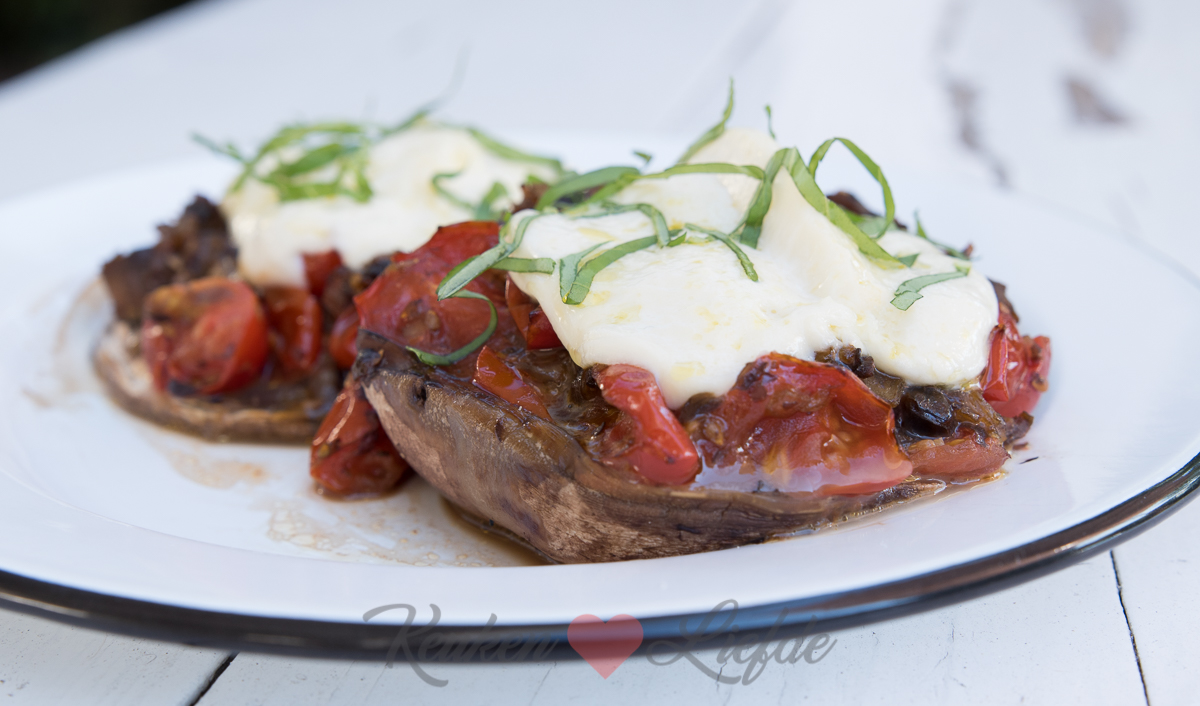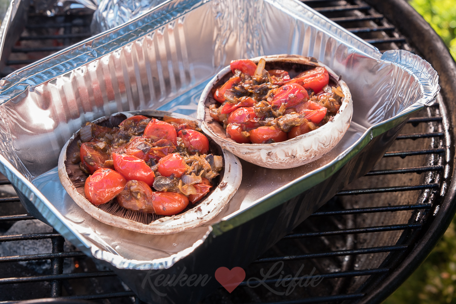 Vul de portobello’s met het tomatenmengsel. Leg de portobello’s in een aluminium barbecuebakje en leg op de barbecue. Grill circa 10 minuten tot de portobello zacht is. Leg de laatste 5 minuten van de grilltijd de plakken mozzarella op de portobello zodat ze kunnen smelten. Garneer vlak voor serveren met fijngesneden basilicum.