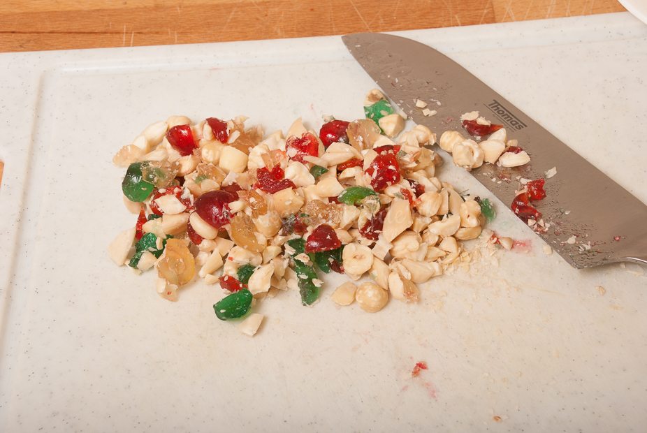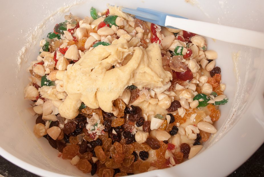 Meng tot een glad, samenhangend deeg. Laat de rozijnen en krenten goed uitlekken en spatel samen met de amandelen, hazelnoten en bigarreaux voorzichtig door het deeg.