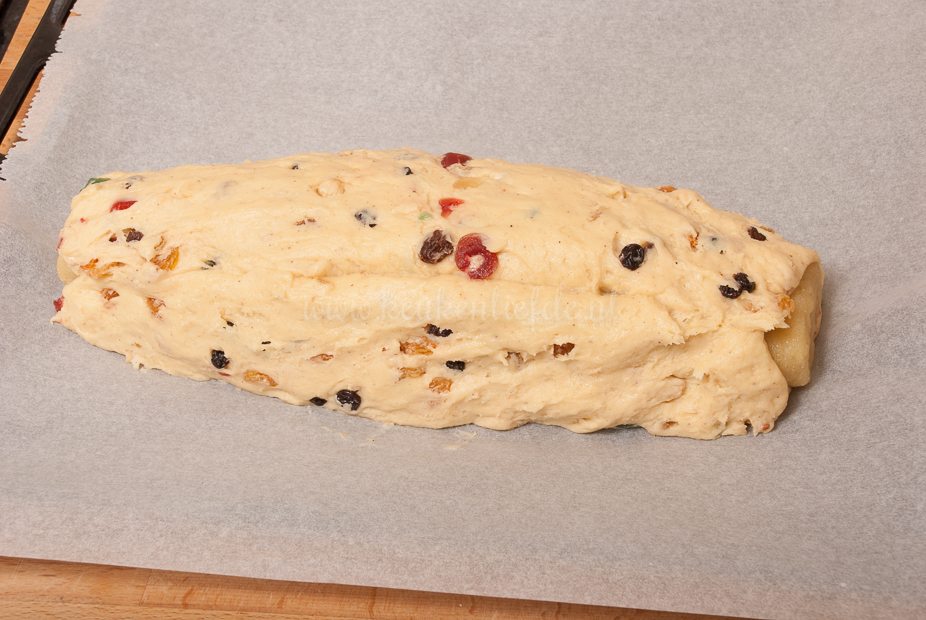 Stort het deeg op een met bakpapier bekleed bakblik. Vorm het deeg met je handen tot een ovaal. Maak iets onder het midden van het deeg een gleuf en leg de rol amandelspijs hier bovenop. Duw het overige deeg over het spijs heen en druk het deeg dicht. Laat 90 minuten rijzen in een oven van 50 graden Celsius.