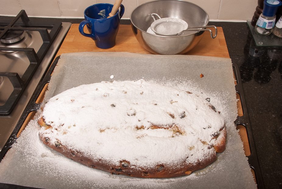 Bak de stol in circa 40 minuten af op 180 graden Celsius, of totdat de bovenkant goudbruin is. Bestrijk de stol direct na het bakken met de roomboter en bestrooi met een dikke laag poedersuiker.