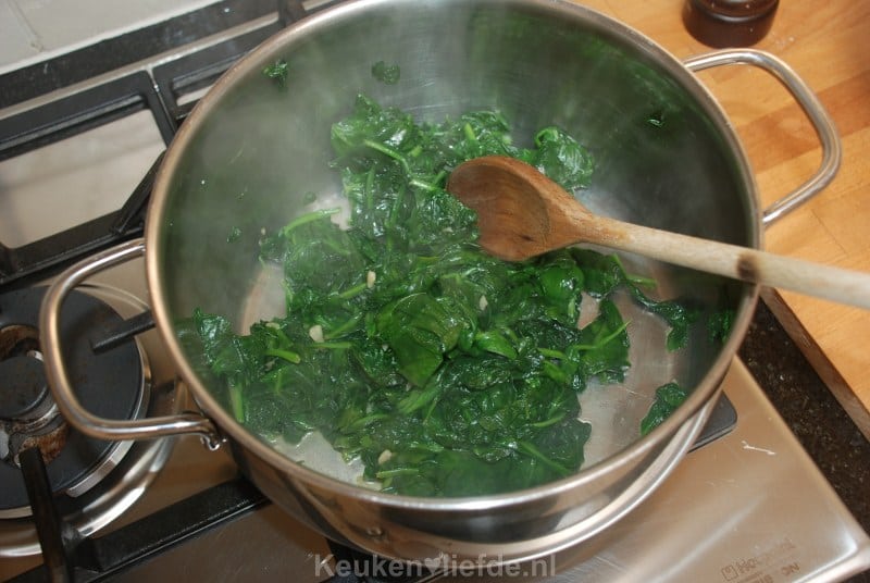 Verhit een grote pan op hoog vuur met wat olie en fruit de knoflook even kort aan. Voeg 1/3 van de spinazie toe en bak even mee totdat het geslonken is. Breng op smaak met zout en peper. Voeg opnieuw spinazie toe en ga zo door totdat alle spinazie geslonken is. Zet het vuur uit.