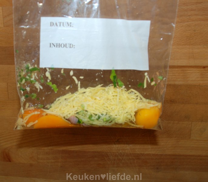 Breng een ruime pan met water aan de kook en zet het vuur dan lager, zodat het water net niet kookt. Doe in iedere zak 2 eieren met de helft van de overige ingrediënten en meng alles in de zak goed door elkaar.