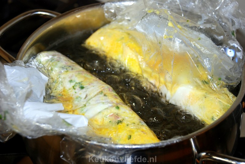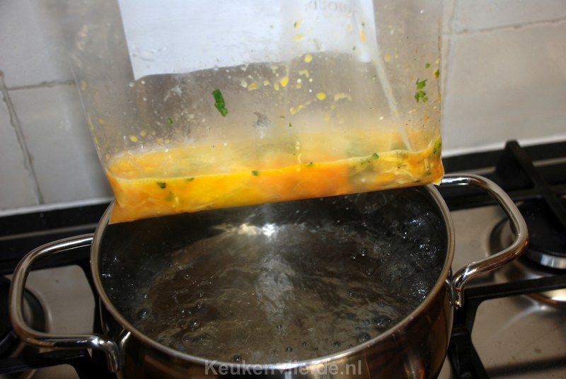 Dit is een geweldige en hele eenvoudige manier om (veel) eieren tegelijk te bereiden. Je stopt de eieren met eventuele smaakmakers, in een speciale kookzak en hangt deze in warm water. In een grote pan kun je makkelijk meerdere zakken tegelijk hangen; ideaal dus als je het ontbijt moet verzorgen voor een grote groep! Het resultaat is geweldig en je hebt naderhand geen vette pannen om af te wassen.