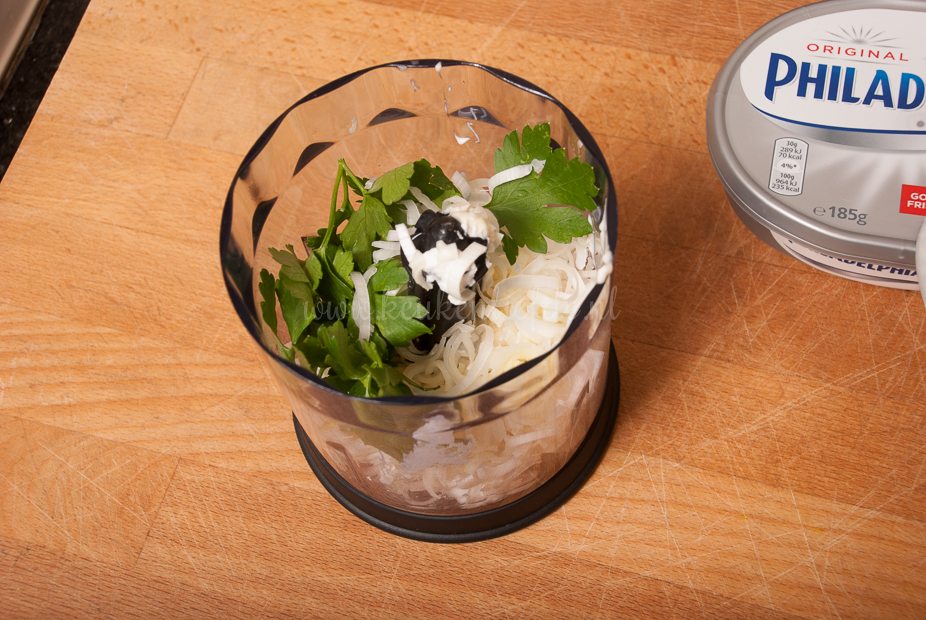 Doe de mayonaise, yoghurt, prei, peterselie en knoflook in de keukenmachine en mix tot een gladde saus. Doe de saus in een kom en klop de roomkaas erdoor.