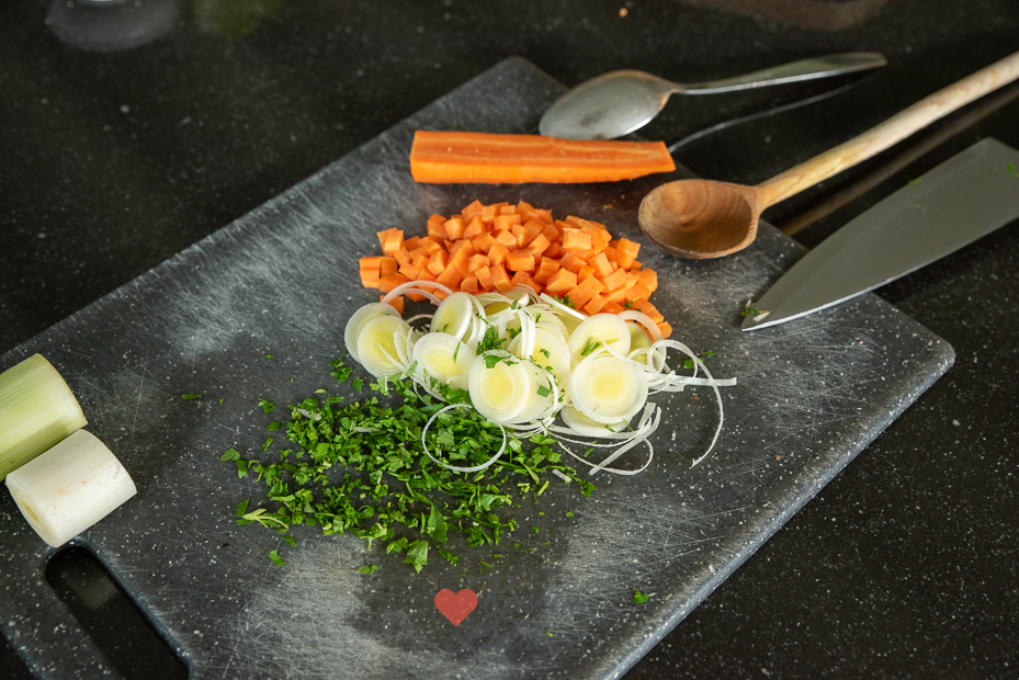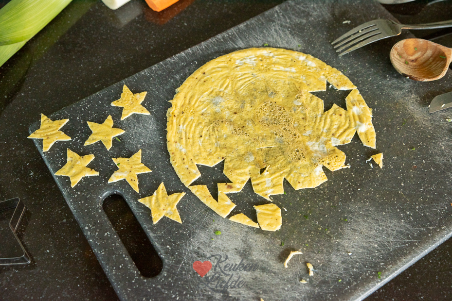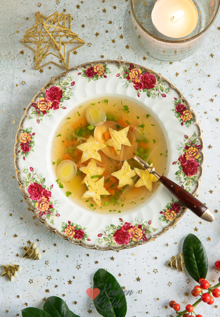 Een makkelijk voorgerecht maken voor kerst? Deze heldere bouillon met verse wortel, prei en doperwten is heel eenvoudig om te maken. Door de sterretjes van ei ziet hij feestelijk en kerstig uit!